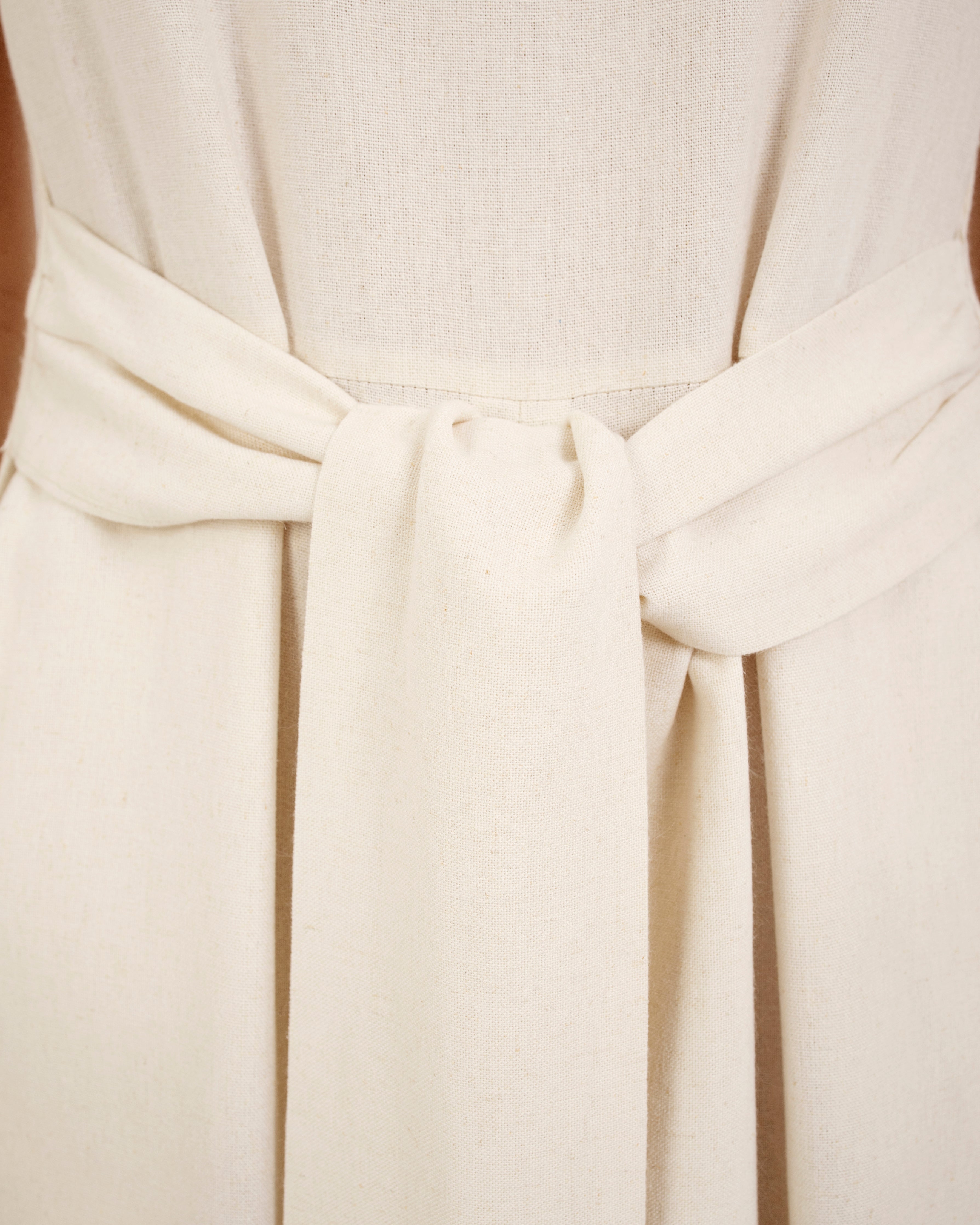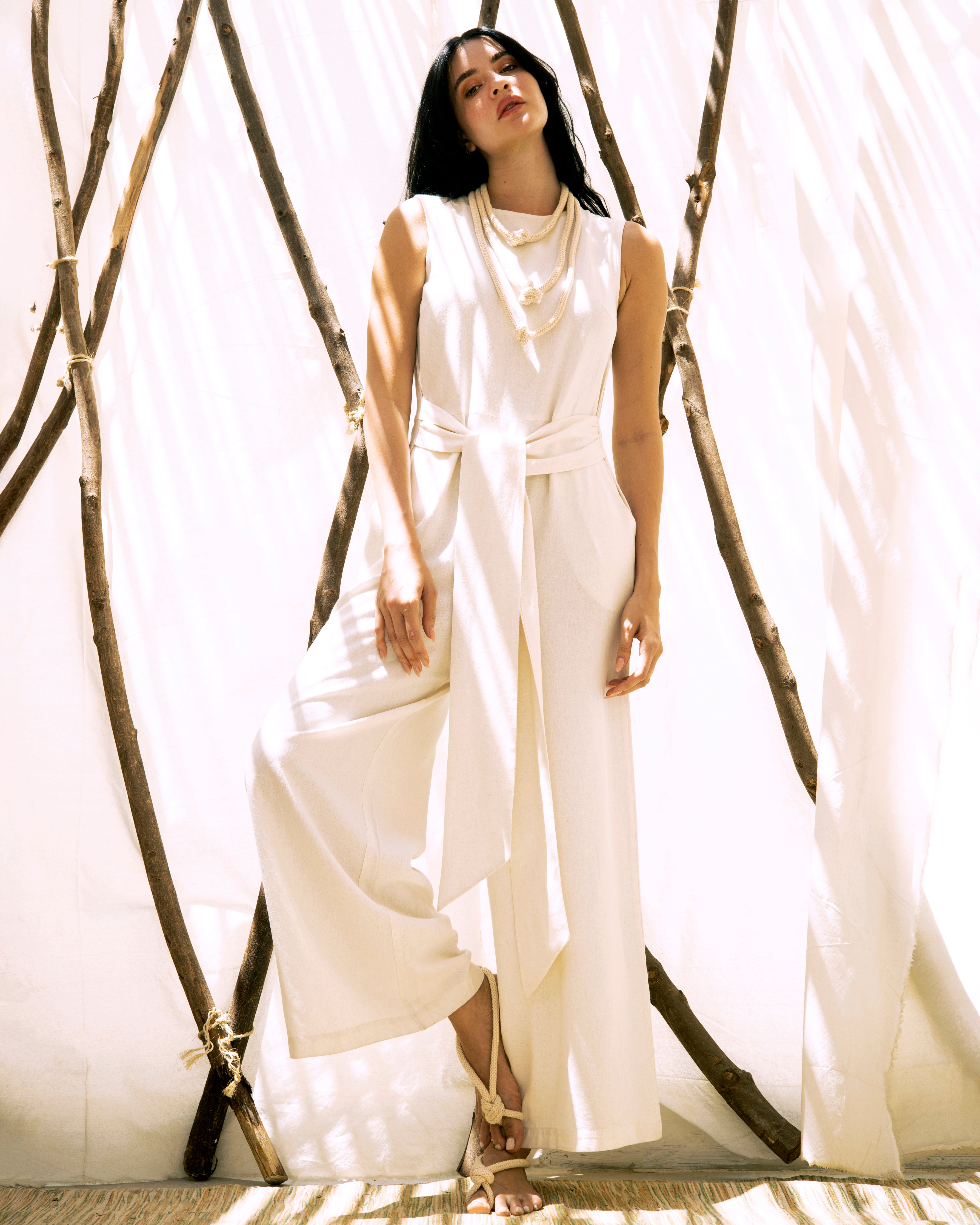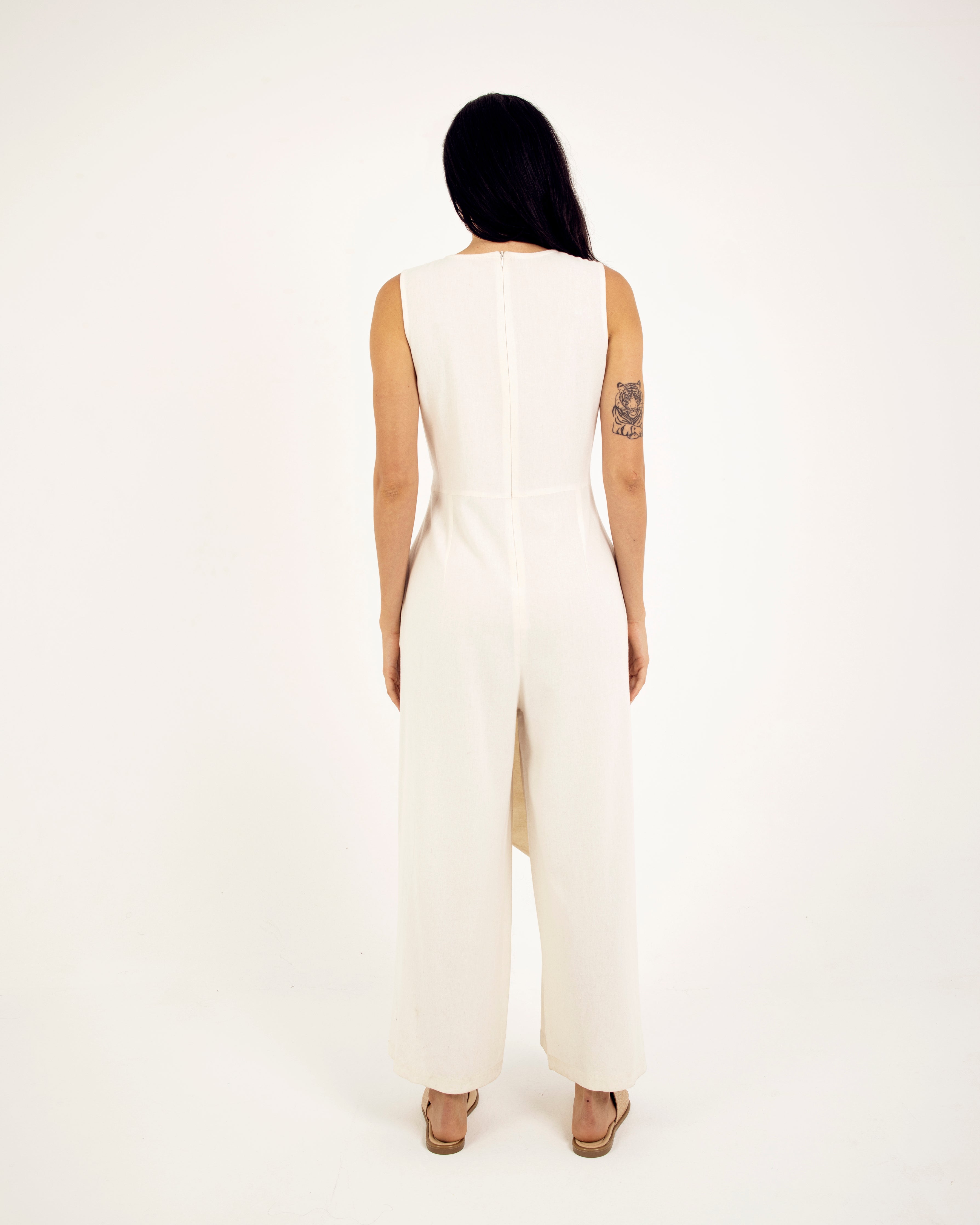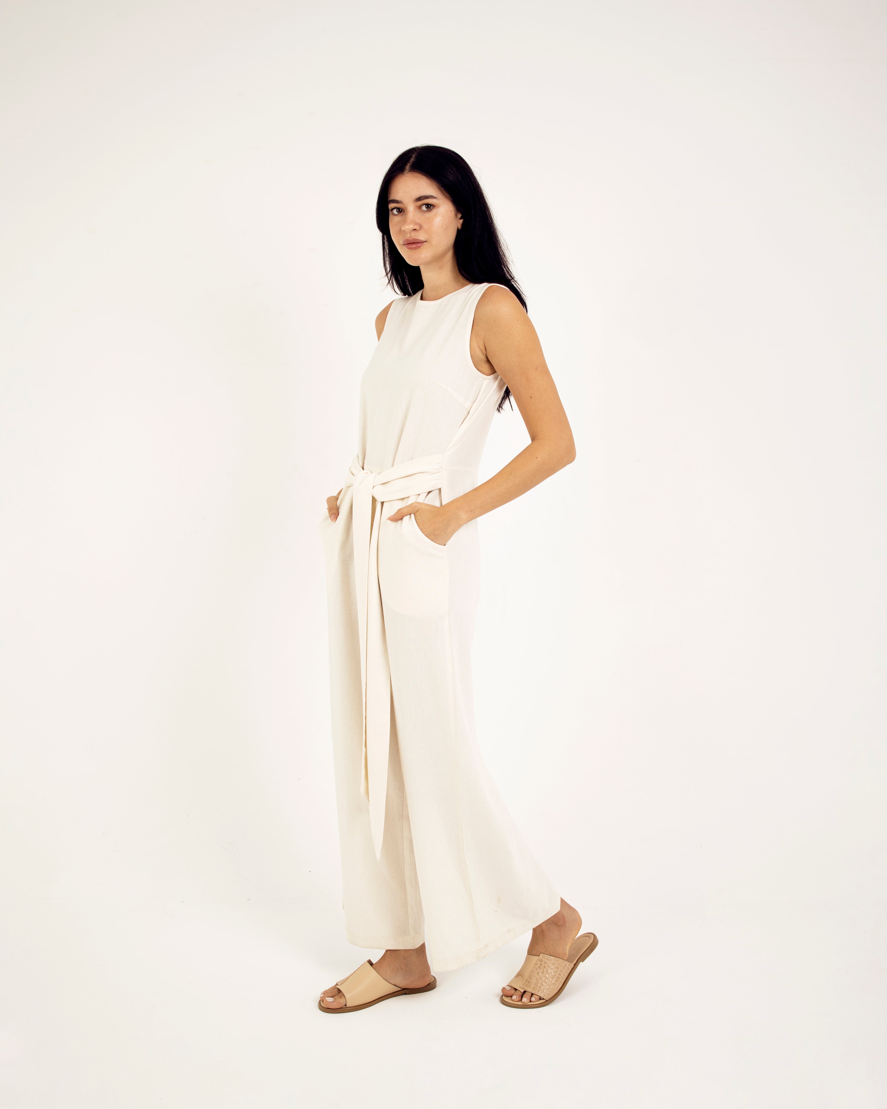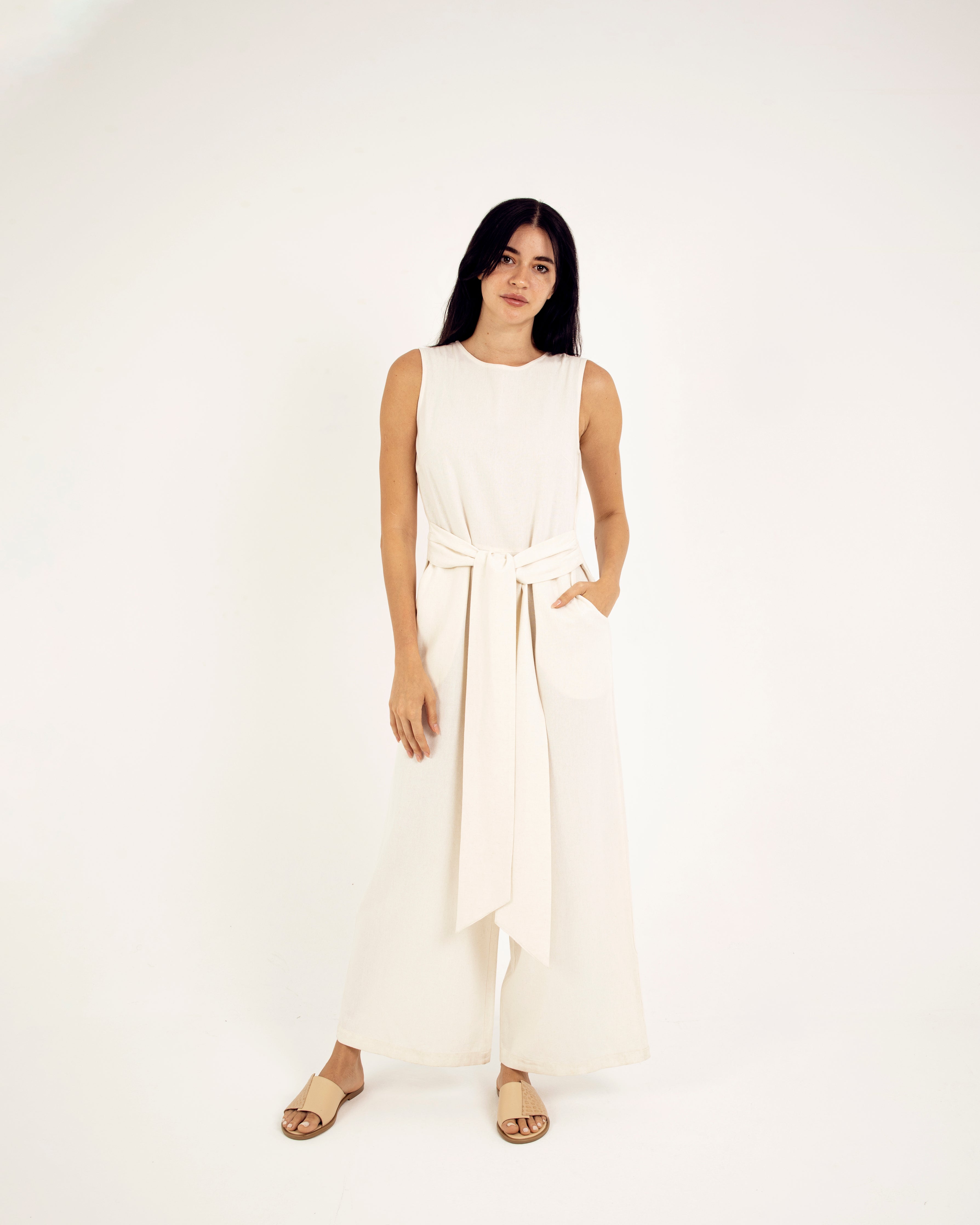 Meet our 100% linen wide leg sleeveless jumpsuit - the perfect blend of comfort and style. Made from soft and breathable linen, this jumpsuit features a round neckline, wide-leg cut, and sleeveless design, attached belt to be tied either on the front or on the back for a flattering look. It's easy to care for and ideal for any summer occasion. Stay effortlessly stylish and comfortable this season with our must-have jumpsuit.